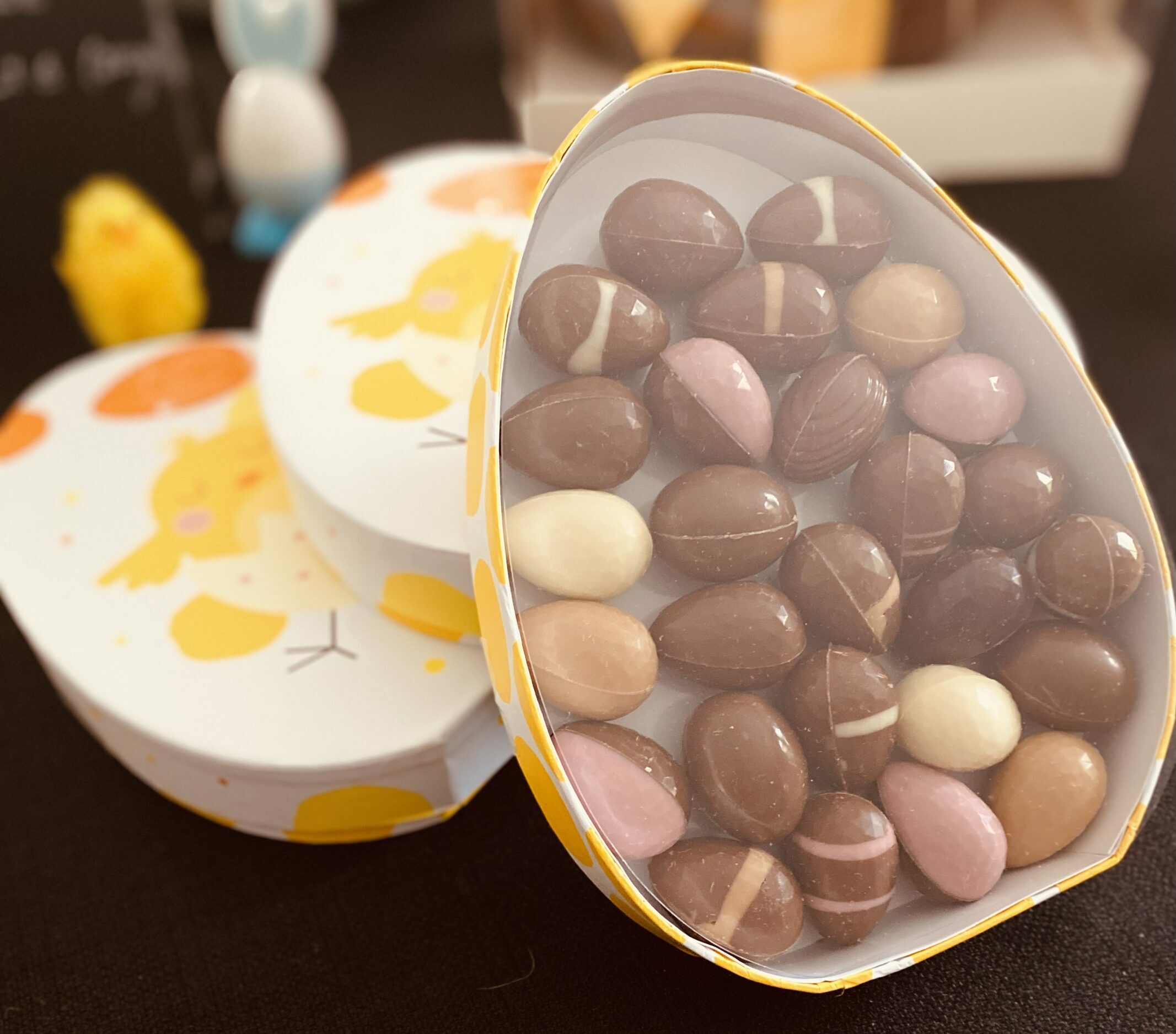 Jolie boîte en forme d’oeuf remplie d’un mélange d’oeufs de Pâques (300gr de chocolat)