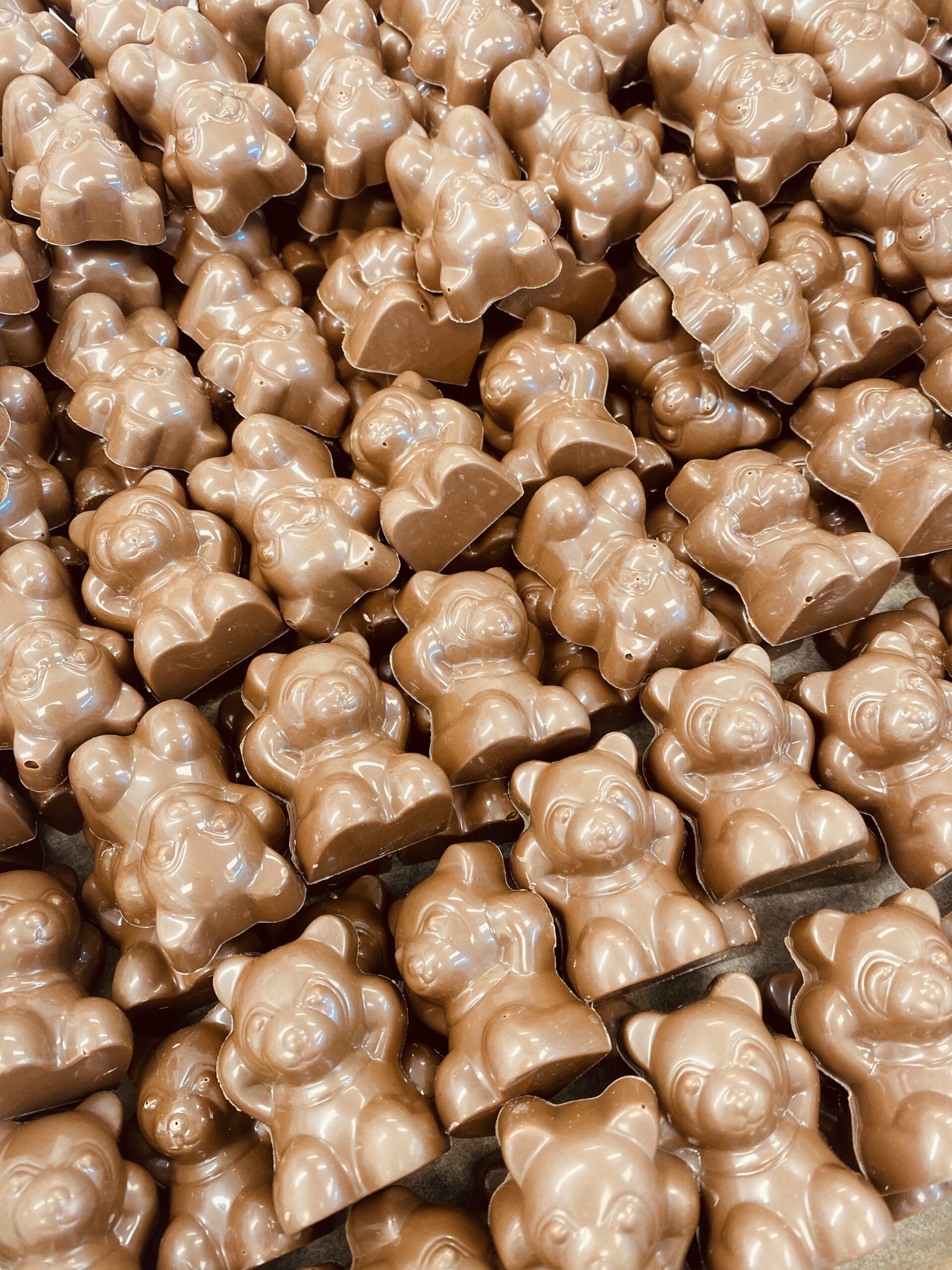 Un oursons en guimauve à la vanille recouvert de chocolat au lait
